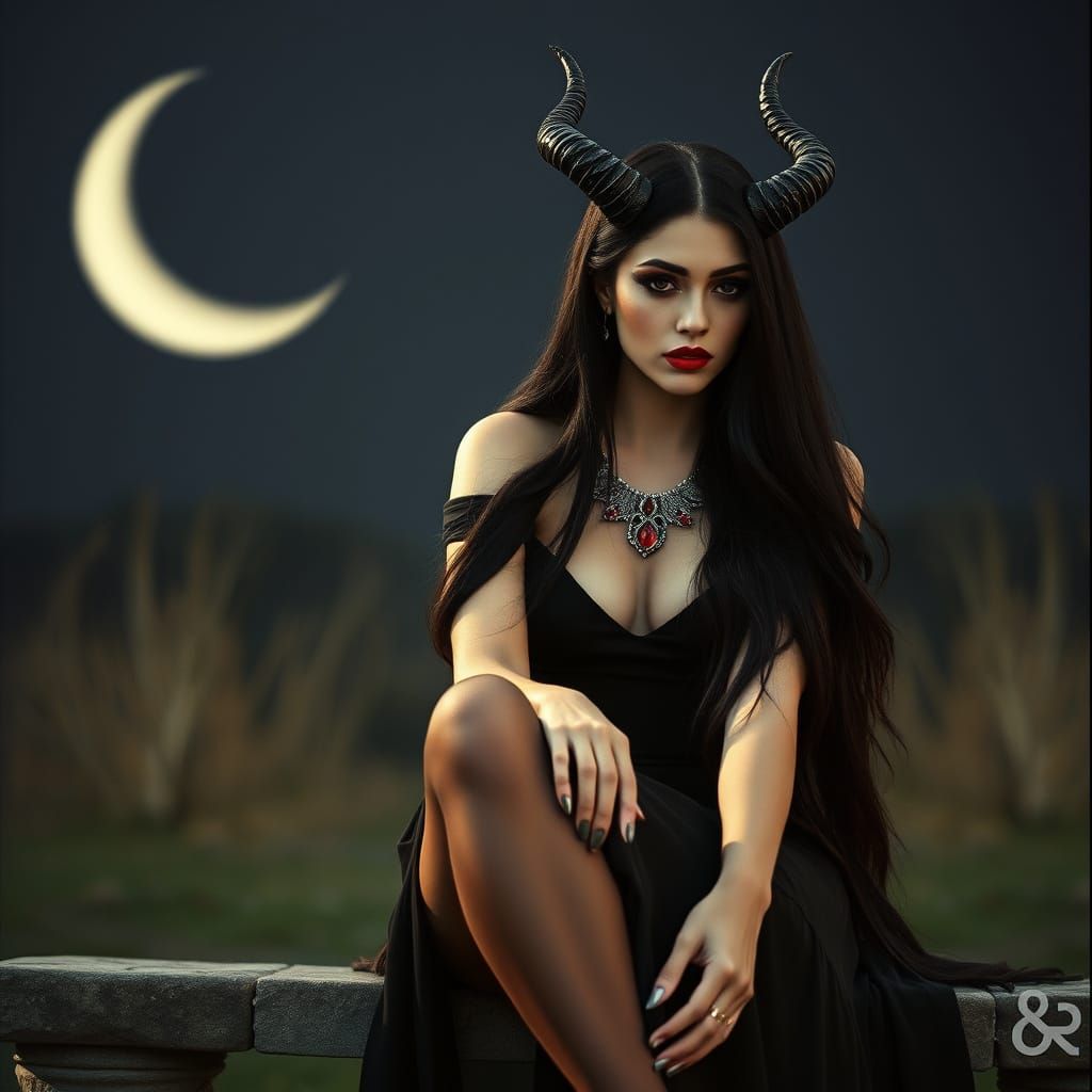 This image shows a stunning female goddess with long black hair, horns, and dramatic makeup, sitting on a stone bench under a crescent moon with falling stars in the background, captured in a cinematic film still with film grain and vignette effects.