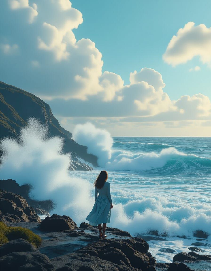 This image shows a woman standing on a rocky coastline as waves crash around her. The image is rendered as a cinematic still with a dark blue and cerulean color palette, and dramatic atmospheric effects.