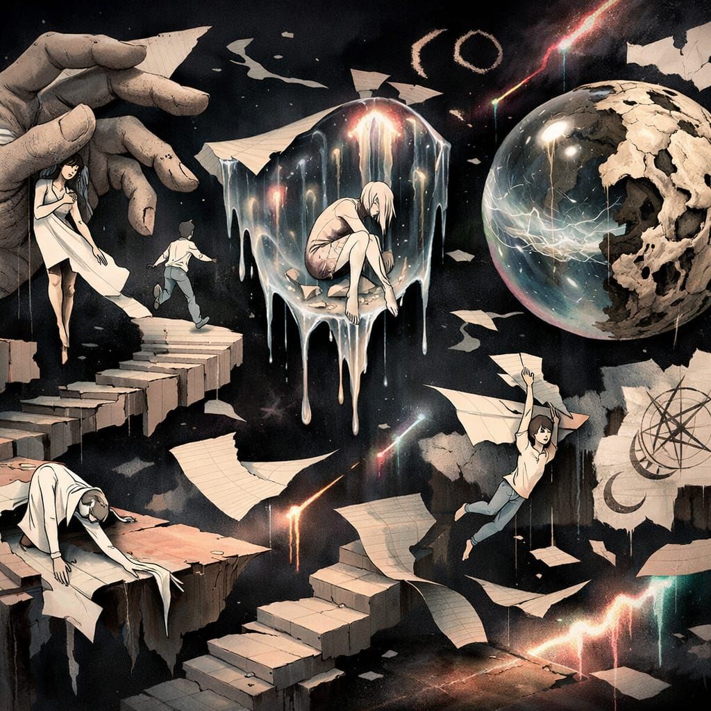 A fractured dreamscape where flat 2D illustrations peel away from reality and drift through a vast 3D void. Paper-thin figures drawn in ink and watercolor bend, tear, and melt as they interact with massive dimensional objects—floating stone hands, liquid mirrors, twisted staircases, and textured orbs ...