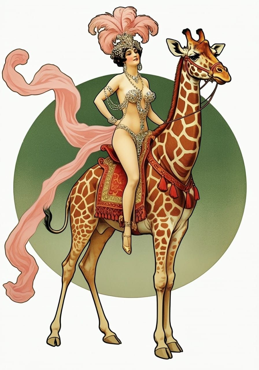 A vintage magazine cover featuring a glamorous woman riding a giraffe. The artwork showcases art nouveau influences with elegant illustrations and a touch of nostalgic charm.