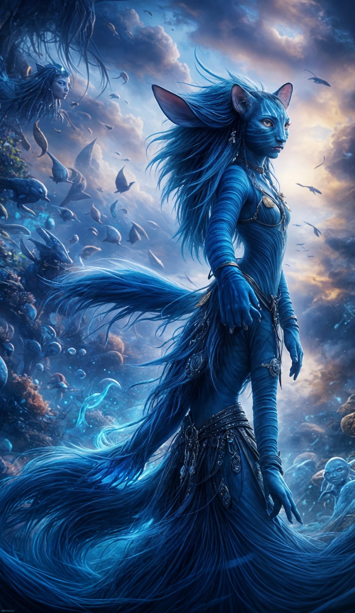 This image features a blue, catlike avatar woman standing near the ocean, evoking an ominous and mysterious atmosphere.