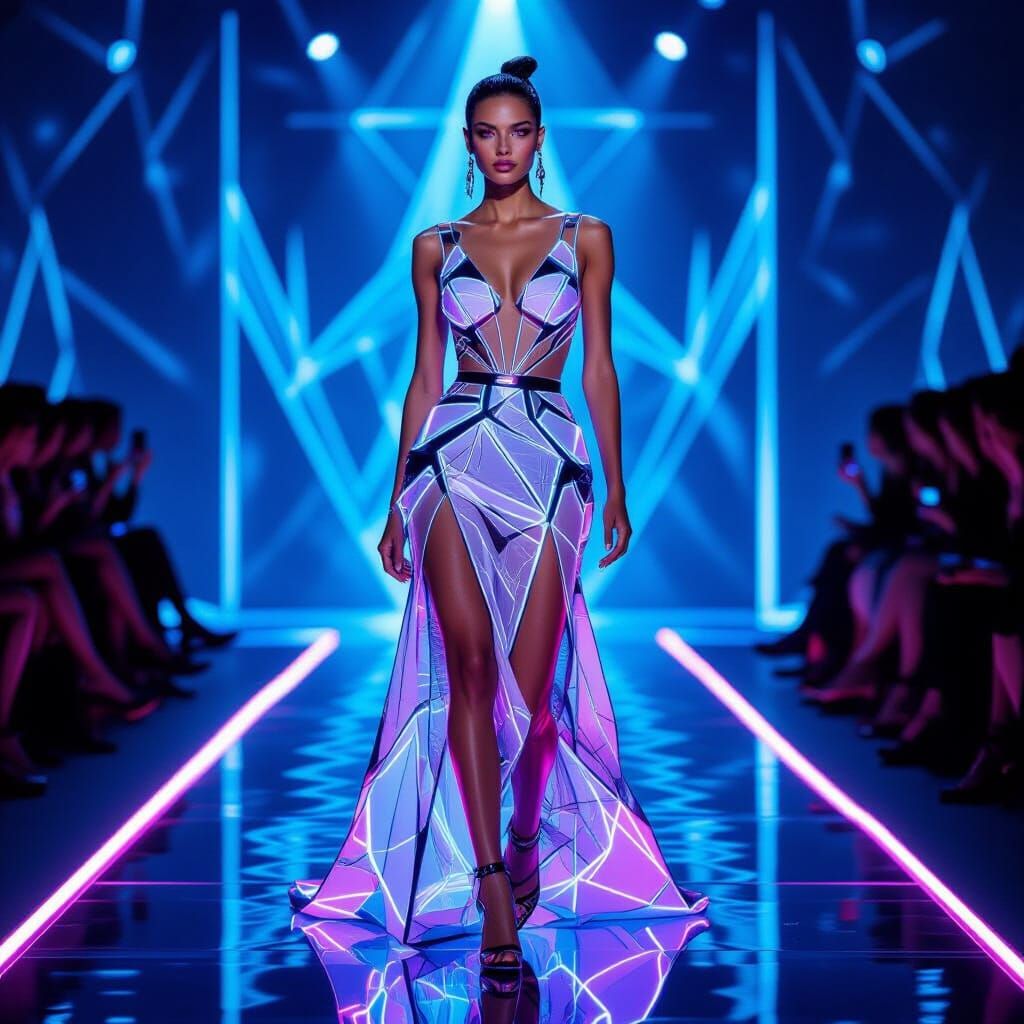 This image showcases a futuristic runway model in a sharp, geometric dress made of transparent, glowing glass panels. Vibrant neon lights create dramatic reflections and shadows, evoking a high-fashion, cinematic feel.