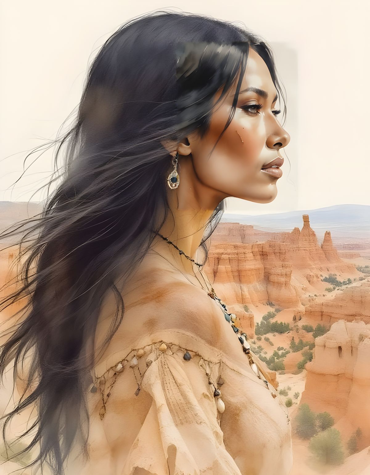 This watercolor painting features a massive rock formation resembling Utah's geology, overlaid with a transparent portrait of a beautiful woman in native attire.