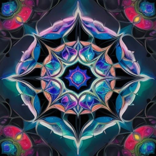 A close-up image of molten glass and liquid metal swirling together in a vibrant dance. Geometric patterns unfold with dappled lighting in this surreal gouache painting.