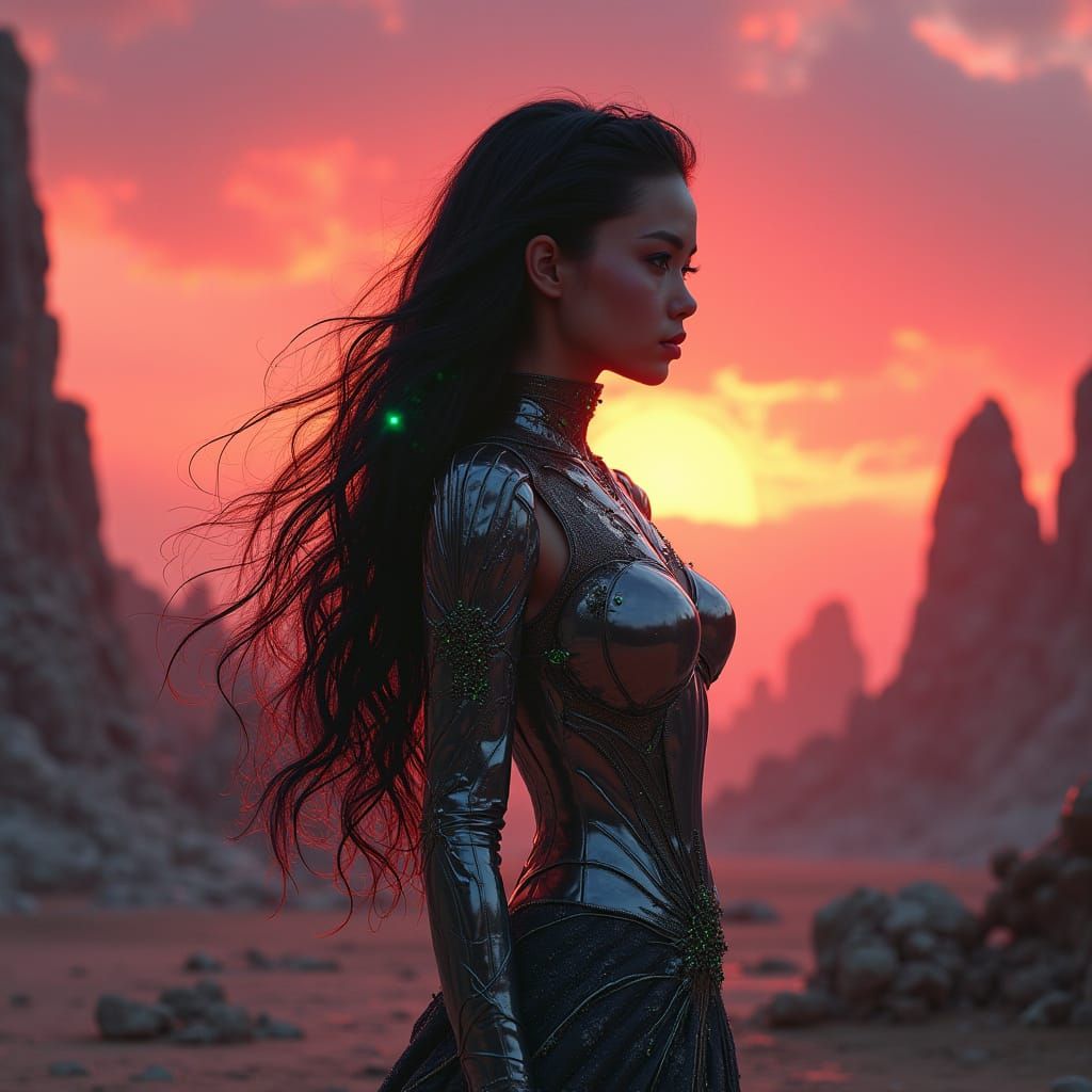 A striking picture of a woman silhouetted against a binary sunset on an alien planet. She wears futuristic armor with glowing green eyes, rendered with Art Nouveau and digital art elements.