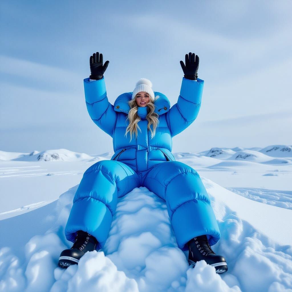 A striking picture of a young woman in a huge blue puffer suit. The subject is sitting on a snowdrift with gloved hands raised in triumph, in a desolate winter landscape. The image is rendered in a whimsical high-fashion style.