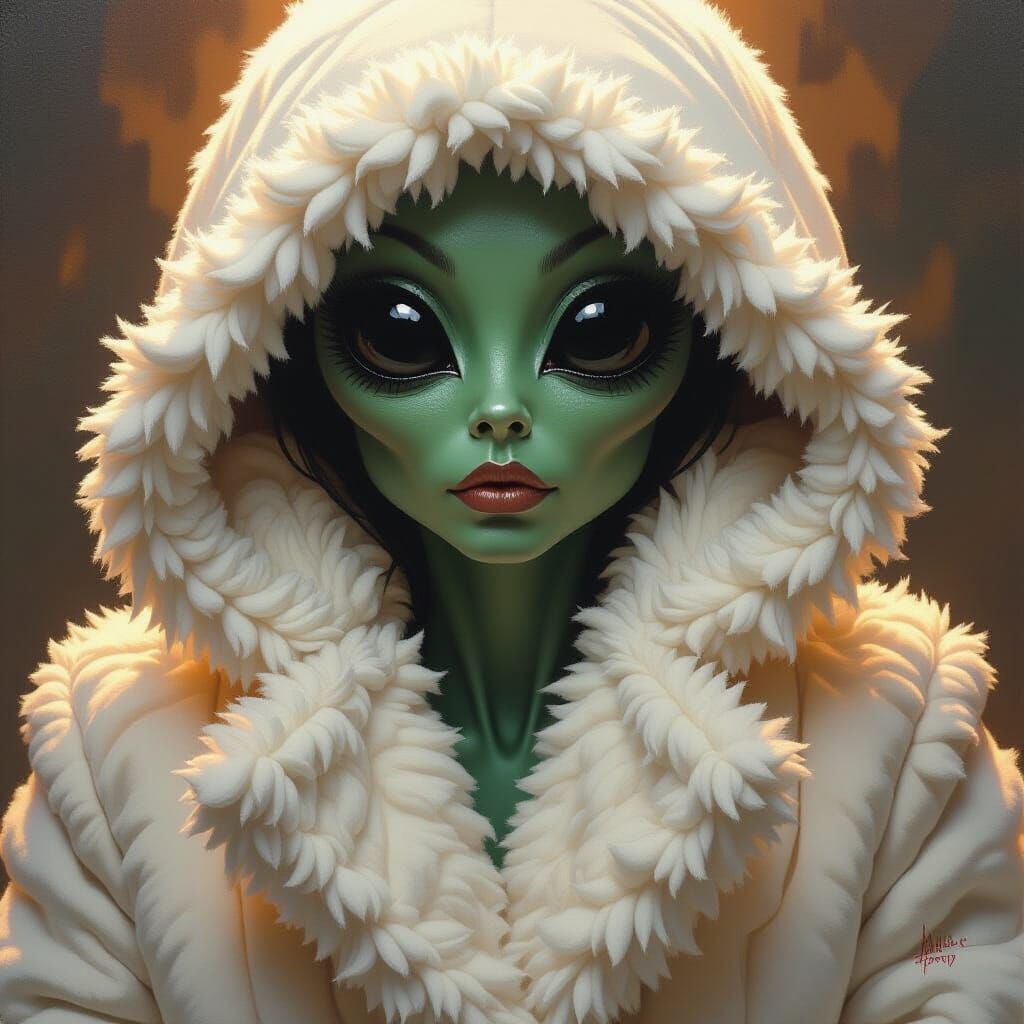 A masterpiece oil painting of an alien with large black eyes and textured skin, wearing a voluminous white fur coat. Features rich impasto textures and dramatic cinematic lighting.