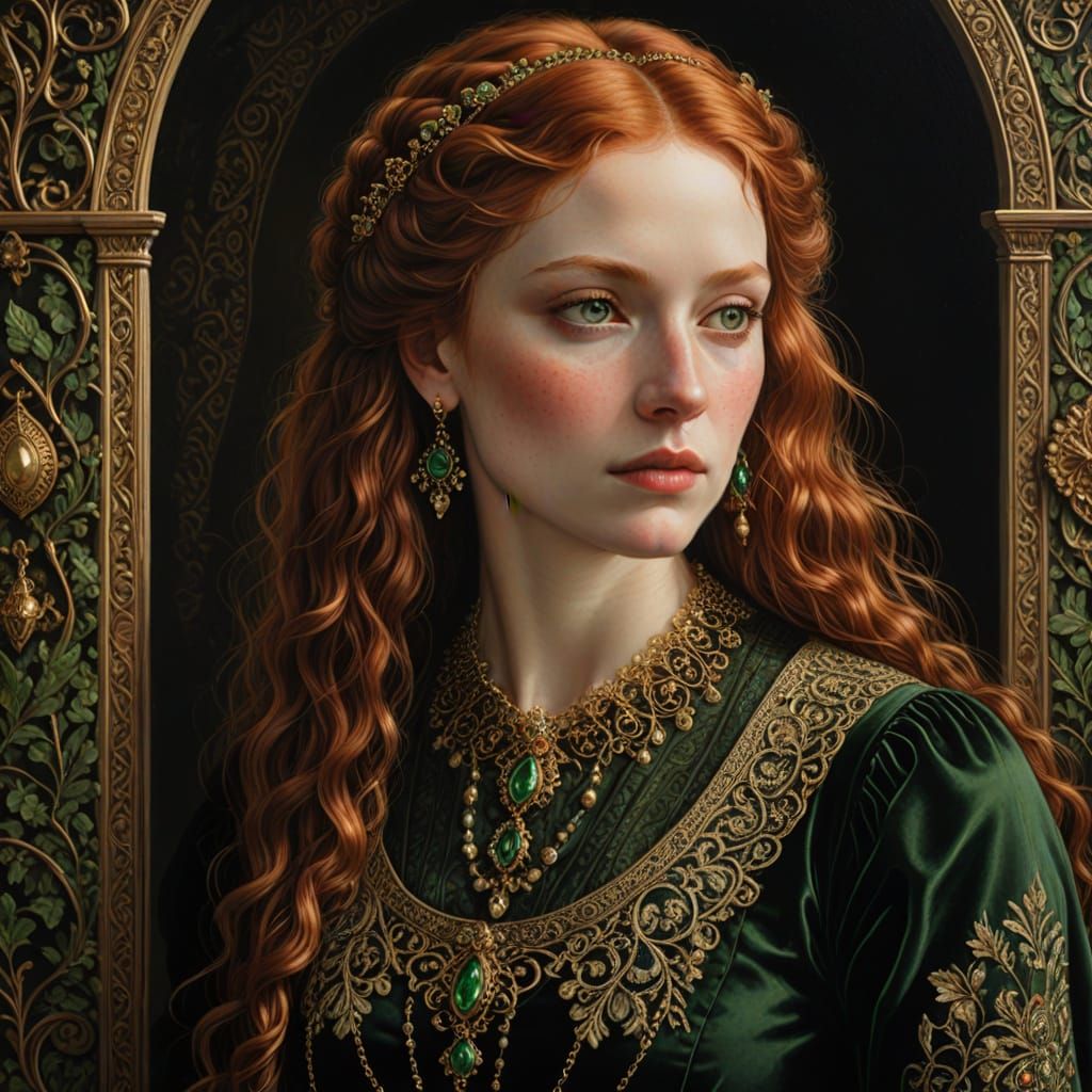 A close-up portrait of a young woman with fair skin, long red hair, and green eyes, adorned with freckles and wearing an intricately designed black and gold dress with lace collar and delicate patterns. Set against a rich, dark tapestry background with a soft, golden glow on her face.