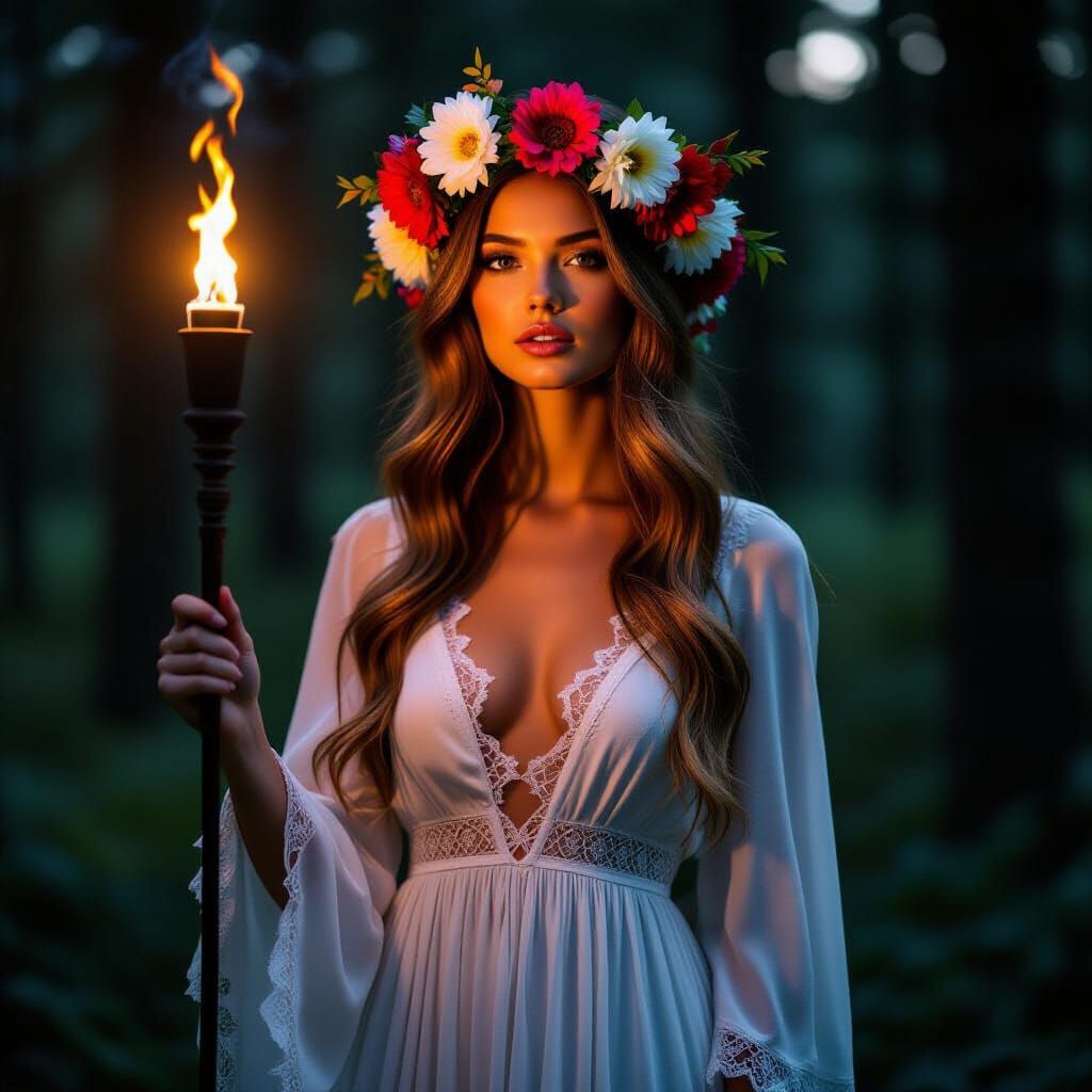 A striking picture of a young woman in a white dress standing in a dark forest. The woman wears a flower crown and is illuminated by the warm glow of a torch in a dreamy, ultra-realistic style.
