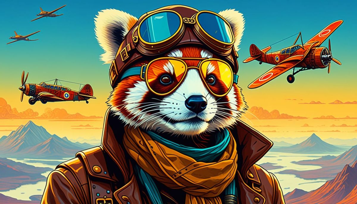 This image features a steampunk red panda in an aviator cap and goggles, piloting a war plane. The illustration captures a seasoned pilot with vibrant, saturated colors and dynamic lighting.