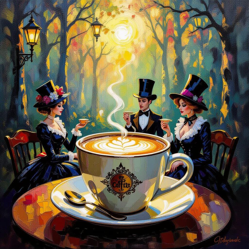A mysterious forest cafe inside a giant cappuccino cup, with spooky fashionista waiters serving magical coffee. Vibrant impasto oil painting with golden hour lighting.