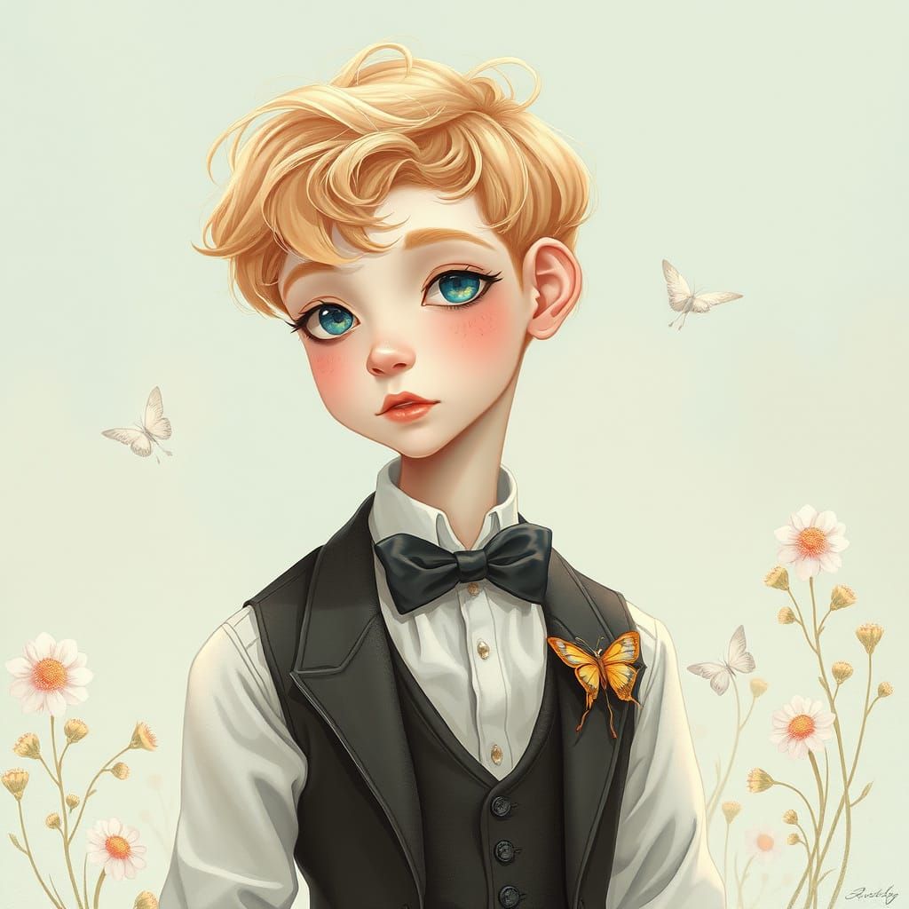 This image shows a delicate, whimsical portrait of a slender boy with strawberry blonde hair, set against a soft, pastel-hued background with intricate details and elegant attire.