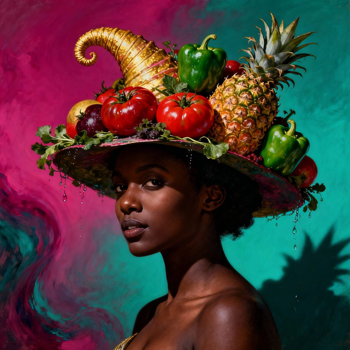 A photorealistic headshot of a woman wearing an intricate hat shaped from ripe fruits and vegetables. Features hyperrealistic detail, vibrant color depth, and dramatic lighting.