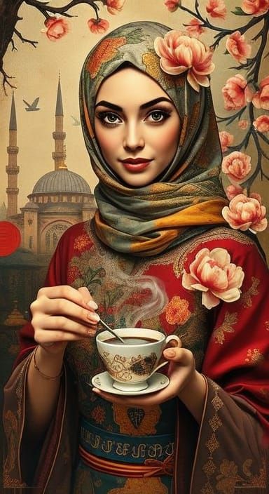 A hyper-realistic portrait of an Arab woman serving coffee in a medieval Istanbul hookah parlor. Fusion of Japanese Regency and opulent gold accents in a Klimt-inspired style.