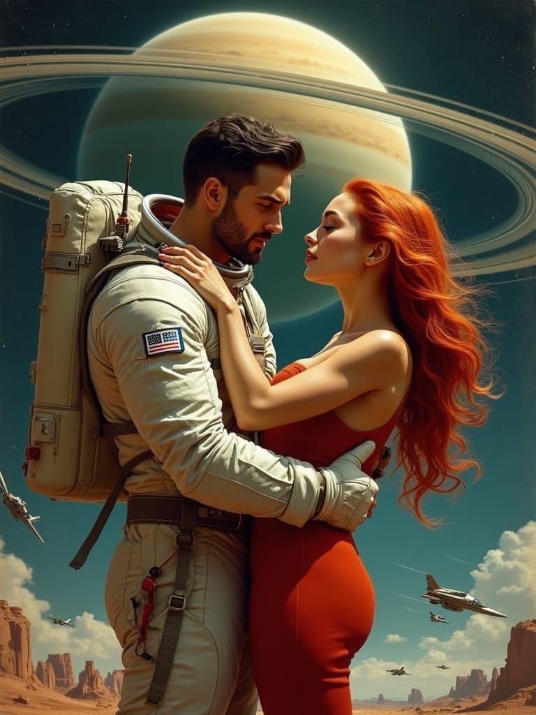 "A retro 50s style male astronaut without helmet holds a female astronaut. Her clothing is skin tight showing off her athletic body. She has flowing red hair, he has a trim beard and dark hair. Behind them the planet Saturn dominates the blackness of space while small fighting space ships roar off into the heavens"