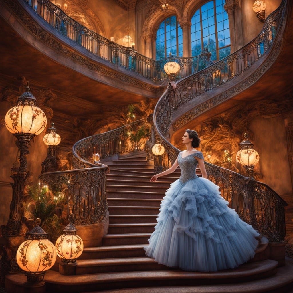 This image shows a woman in a ballgown at the base of a fantasy staircase. Cranes and birds accent the scene, illuminated by lanterns and cascading pearls, in a luminist style.