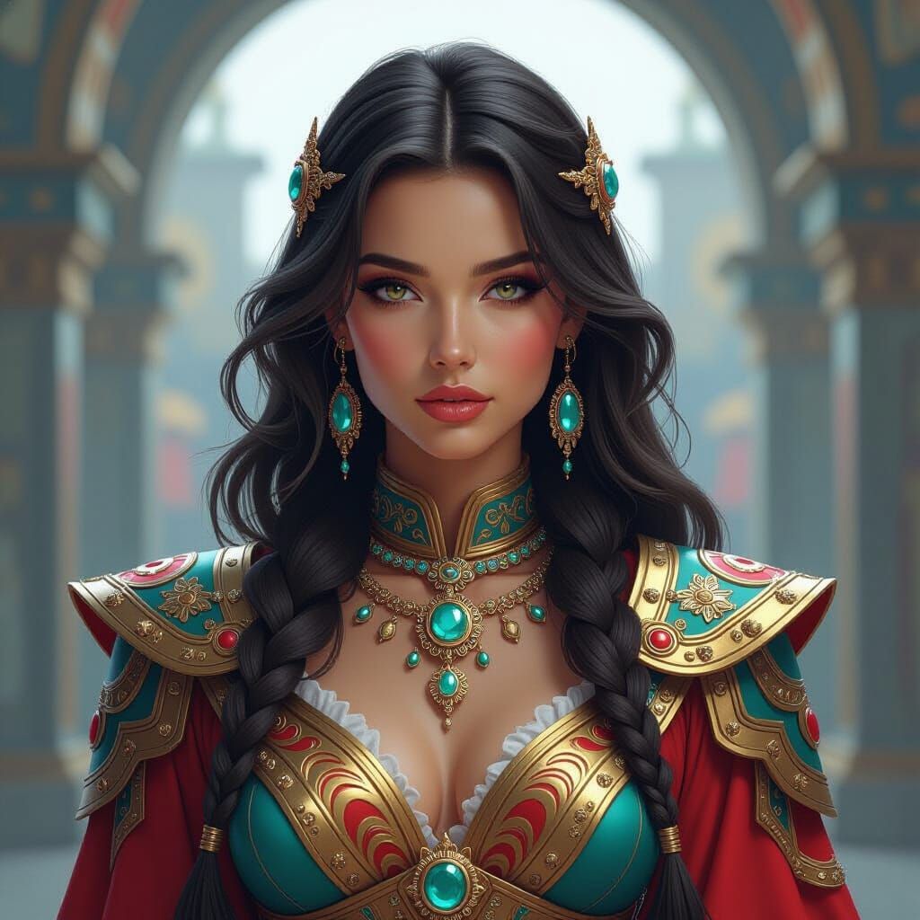 A hyperrealistic portrait of a warrior girl in colorful art nouveau style clothing. The image evokes sleek futurism with neon aesthetics, creating a vibrant digital painting.