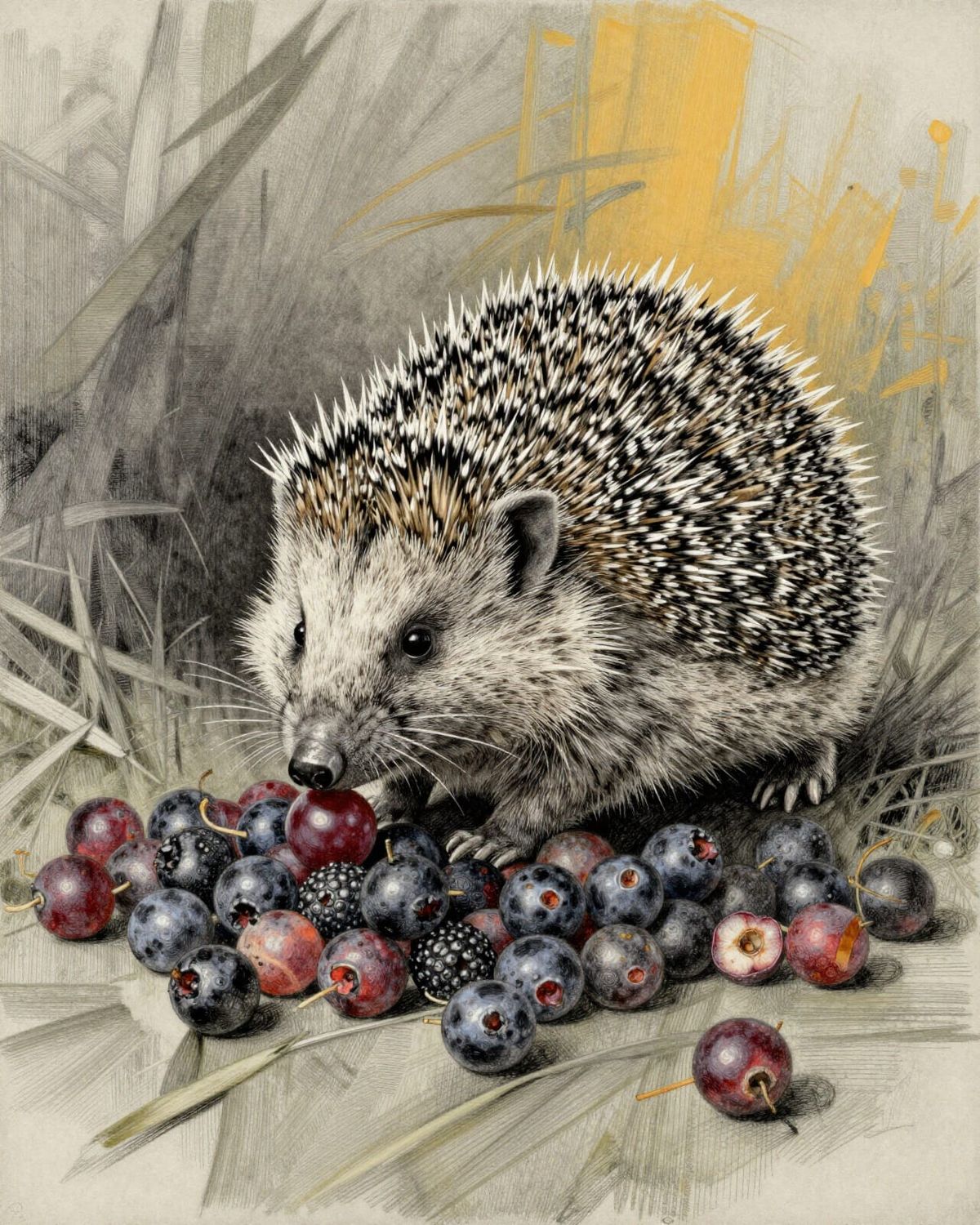 This image shows a hyperdetailed charcoal drawing of a hedgehog joyfully perched atop a mound of berries. The artwork features fine details and complementary colors, evoking a classic illustration style.