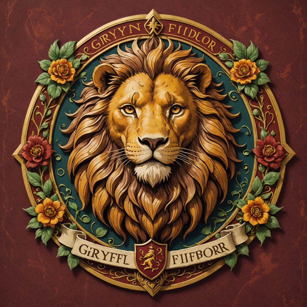 This enchanting Studio Ghibli-inspired emblem features a majestic lion with a flowing golden mane, surrounded by an ornate crest with glowing gemstones and magical sparkles. The soft, dreamy shading and warm golden hues evoke a sense of bravery and determination.