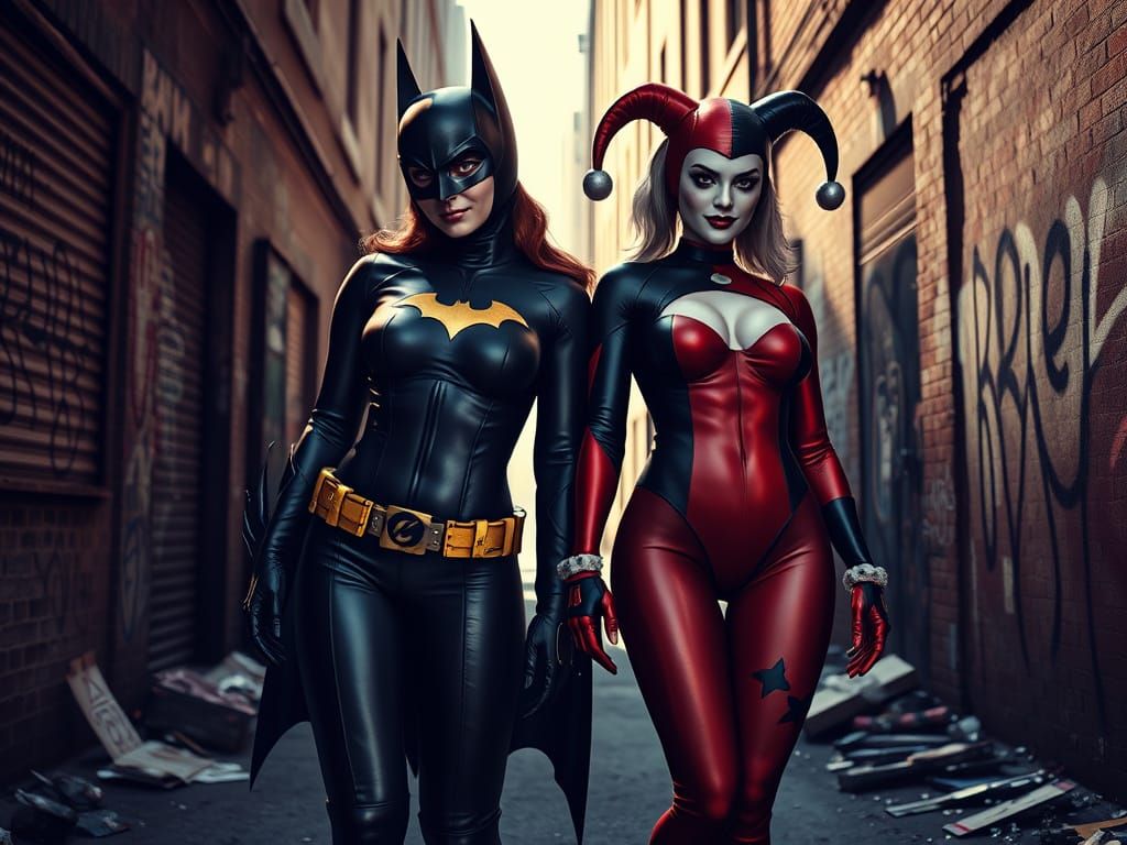 envision a photorealistic and hyper-detailed scene of Batgirl and Harley Quinn, both with huge bosoms, standing side by side in a sun-drenched city alley. Batgirl is clad in her classic black and yellow suit, while Harley Quinn sports her iconic red and black jester outfit. The alley is filled with graffiti ...