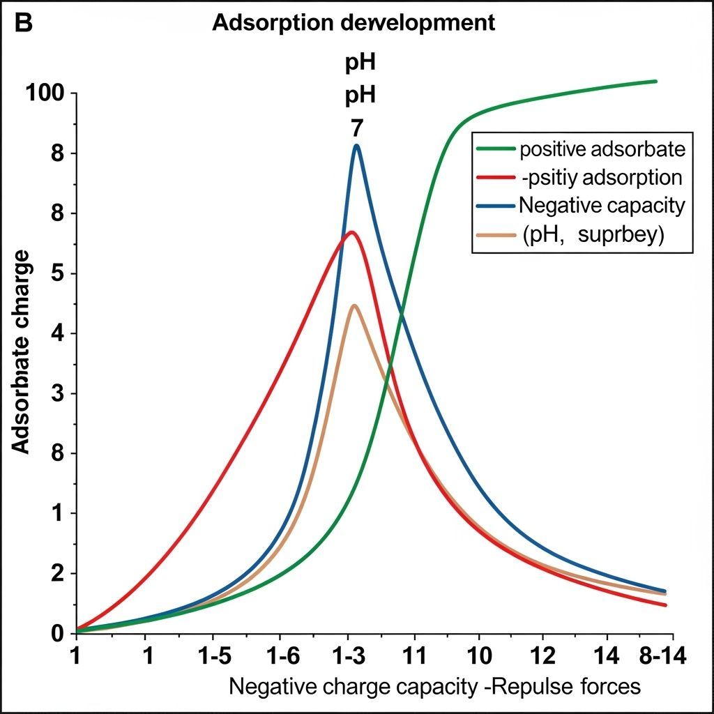 This infographic visually explains adsorption chemistry, showing how adsorbate charge and capacity change with pH levels on negative surfaces. It uses scientific journal graphics and a vibrant palette for clear data visualization.