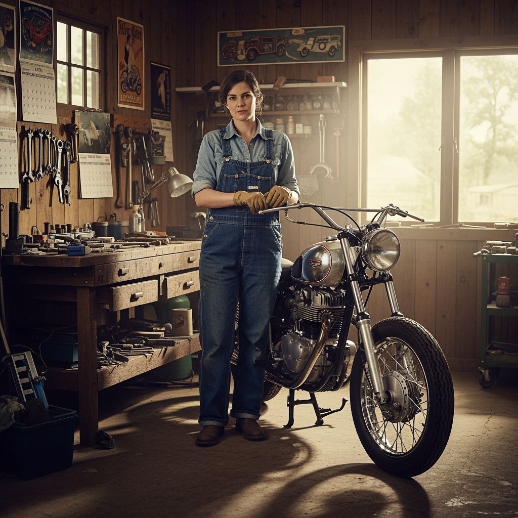 A photorealistic image of a female mechanic standing next to a vintage motorcycle in her workshop. The scene evokes golden age automotive photography with a touch of Americana.
