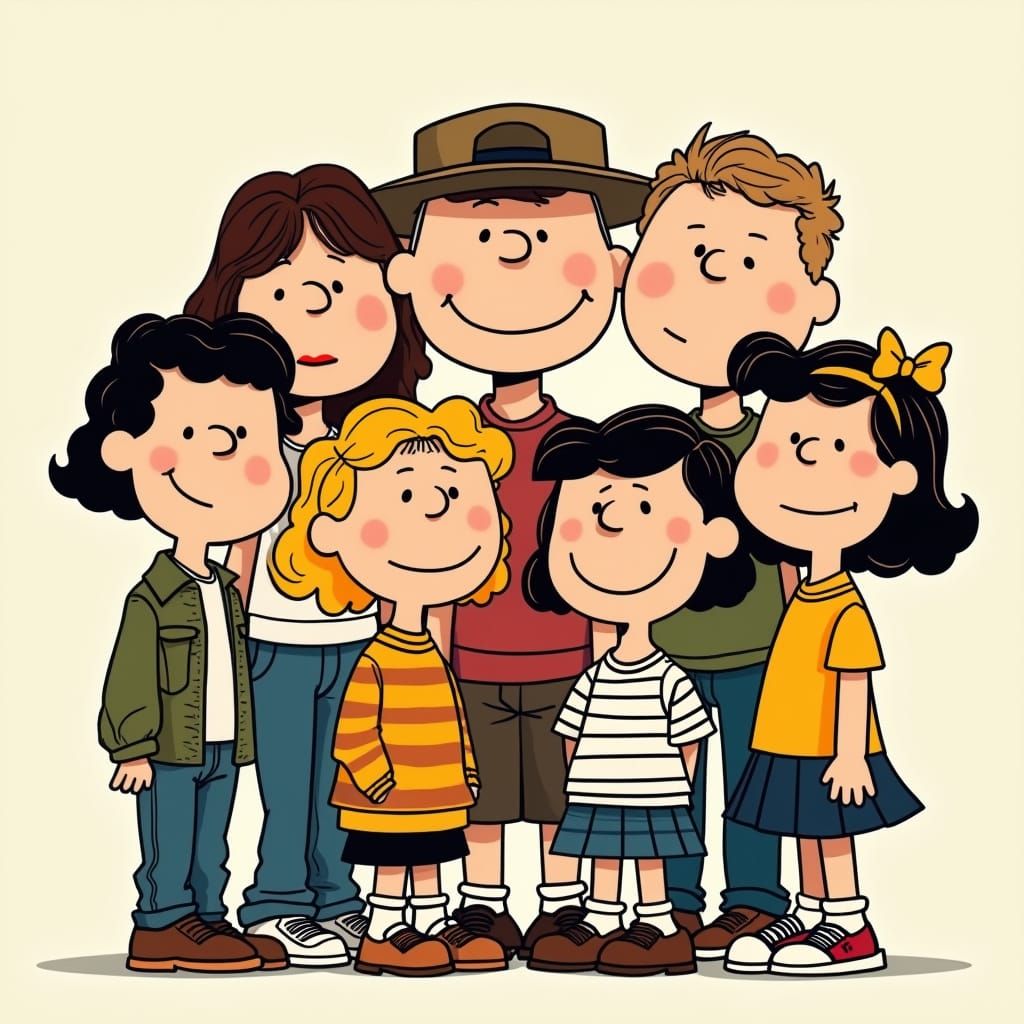 This vibrant illustration captures a group of friends posing together in bold, bright colors, reminiscent of classic cartoons and modern digital art.