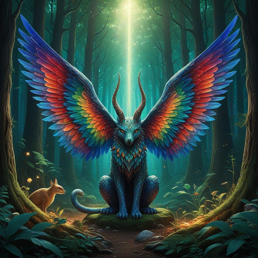 The Patugy Pantheon revered a magnificent creature known as the Chakyehga. This hybrid guardian was said to roam the celestial meadows of the Patugies’ afterlife, ensuring balance between realms. With the noble body of a wolf, crowned by a flowing mane akin to a lion’s glory, and adorned with gazelle-like horns spiraling in divine symmetry, the Chakyehga radiated power and elegance. Its enormous wings shimmered with every hue of the rainbow, creating a cascade of color whenever it took flight. Legend has it that the Chakyehga’s celestial essence flowed through every part of its being—even its urine, which exuded a fragrance so intoxicating and otherworldly that the Patugies crafted it into their rarest perfumes, a scent believed to grant visions of the gods themselves.