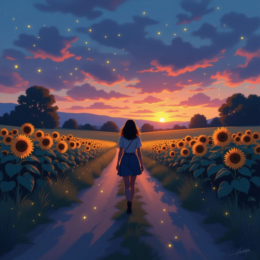 This image shows a woman walking along a sunflower-lined country road at dusk. Fireflies glow in the warm light, creating a magical realism scene reminiscent of impressionist dreamscapes.
