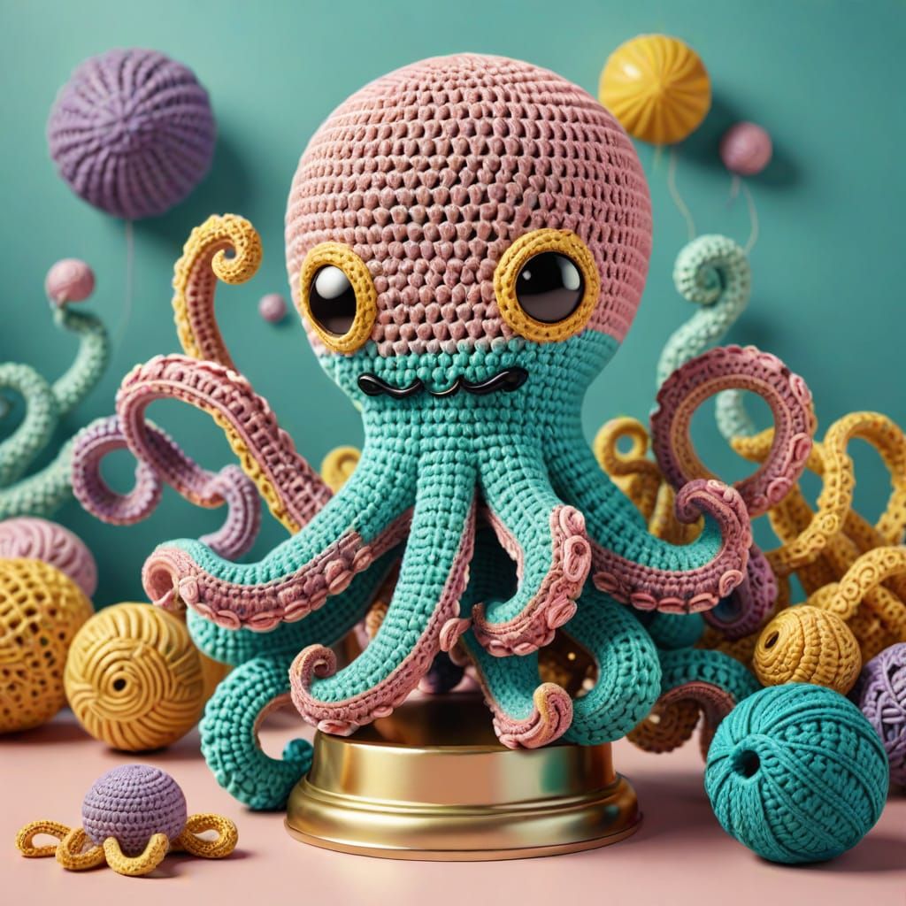 A vibrant close-up of a crochet winner trophy featuring an octopus plushy. Rendered in pastel colors with soft lighting and golden accents, creating a playful atmosphere as digital art.