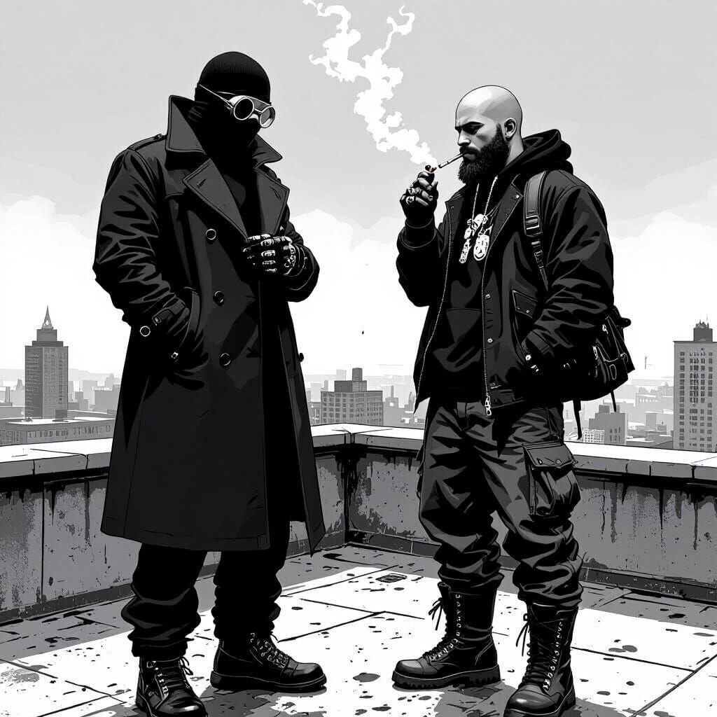 A stark, monochromatic image shows two men on a rooftop, one lanky in a ski mask and trench coat, the other rugged with a beanie, in a high-contrast film noir aesthetic.