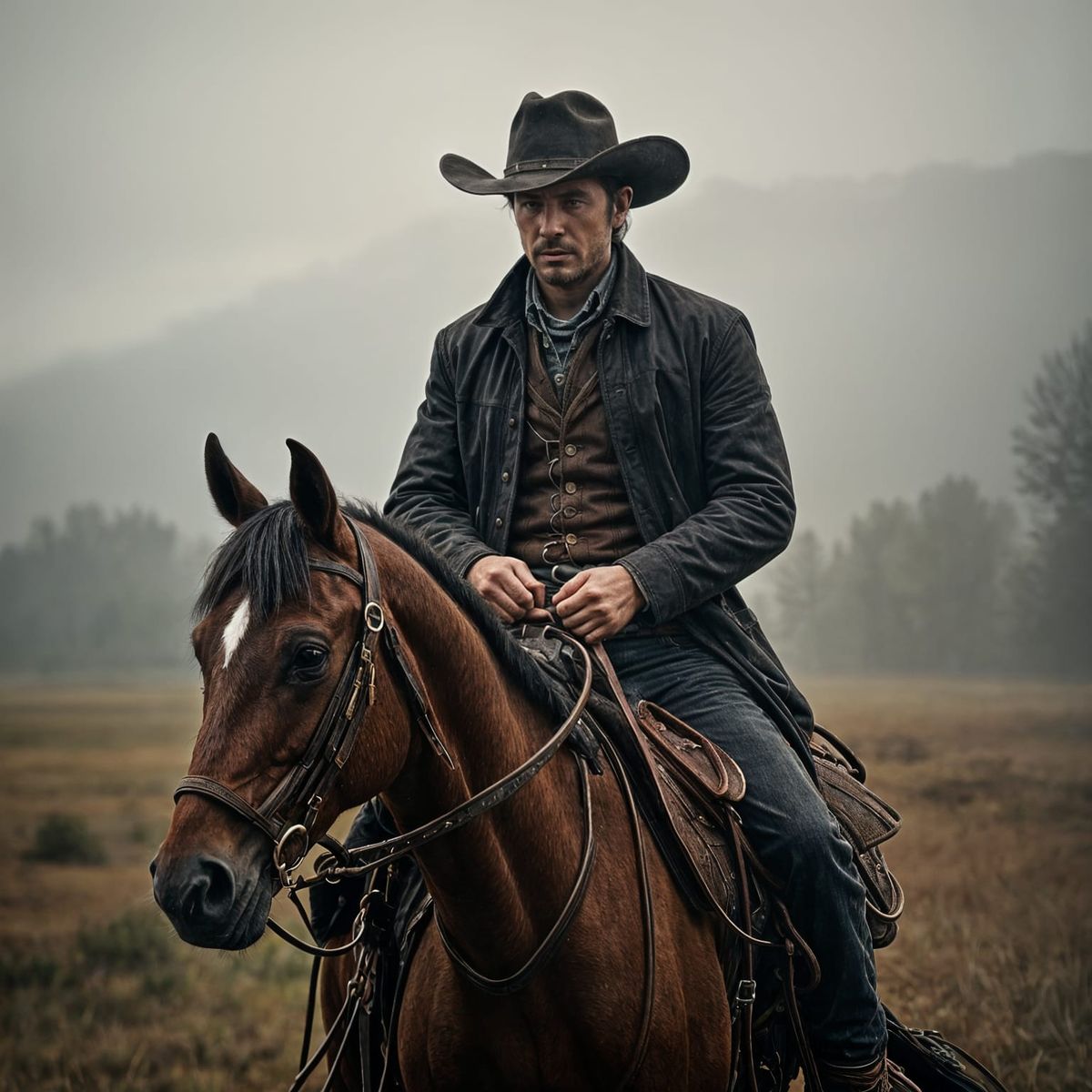 This image shows a cowboy on horseback, captured with intricate details in a hyperrealistic and cinematic style. It features sharp focus, high contrast, and a moody atmosphere.