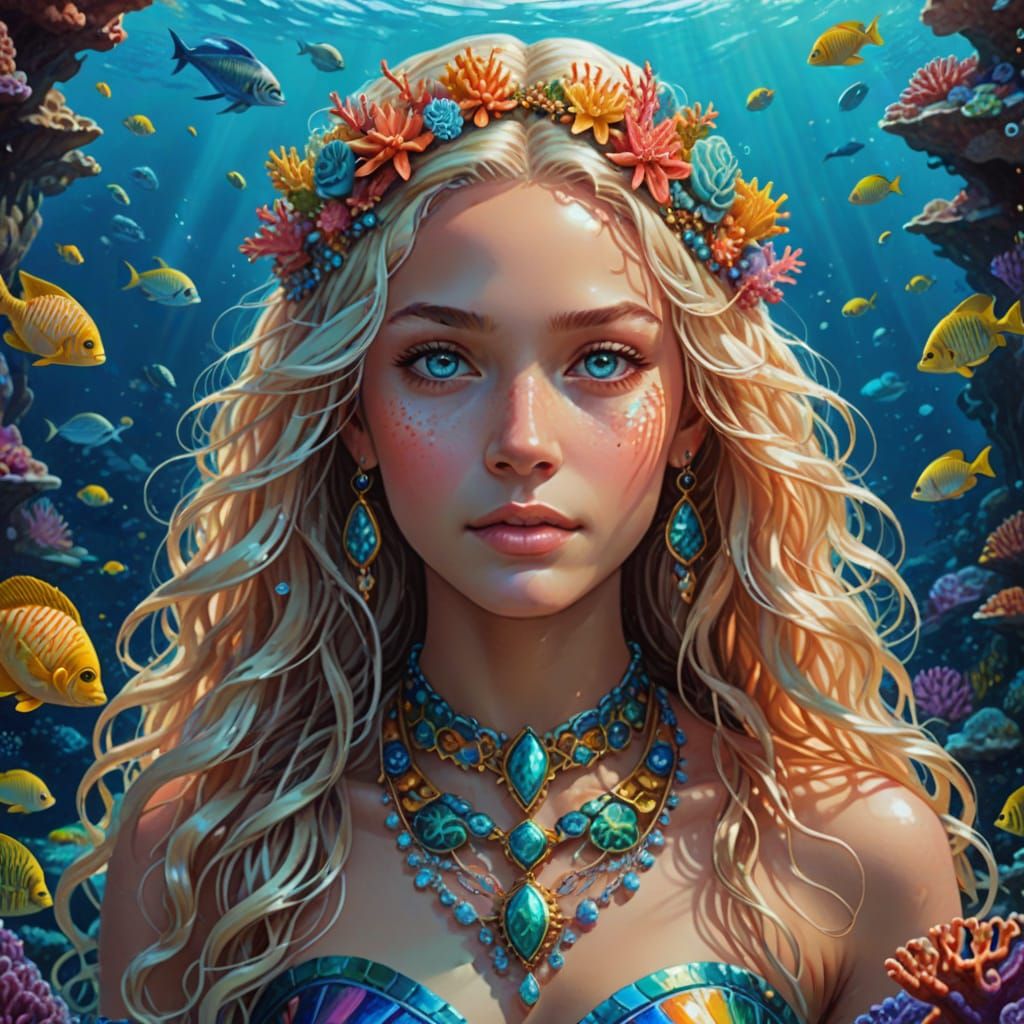 This image shows a close portrait of Nesaea, a Nereid Goddess, with long, wavy platinum blonde hair, rainbow highlights, and gentle blue eyes. She wears a rainbow gown and neckpiece, against a vivid underwater background.