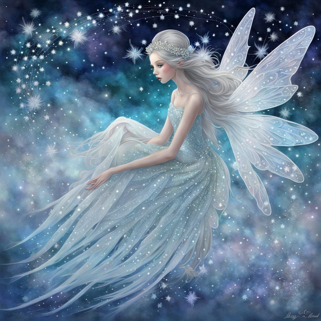 This image shows a detailed digital artwork of an ice fairy with sparkling, frost-like wings. She hovers elegantly under aurora-filled skies, her silk-like hair trailing glitter.