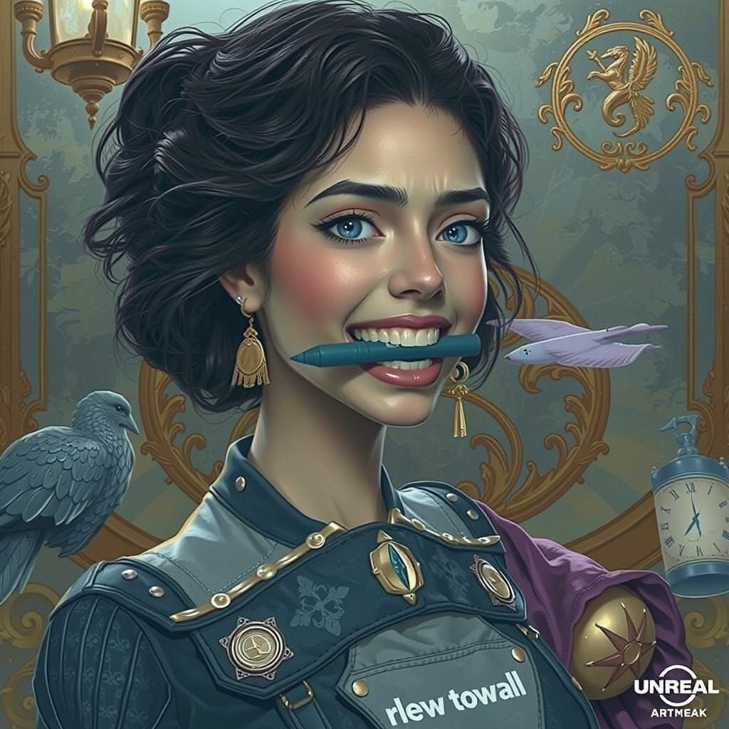 This image depicts a woman's desperate attempt to speak with a white marker lodged between her teeth, set against a rich black background with deep blues and purples, featuring intricate textures and vibrant colors reminiscent of high-fantasy art