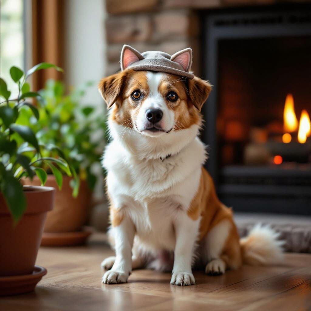 This hyperrealistic image features a dog dressed in a cat-ear hat, elegantly sitting by a fireplace. It mimics a cat's posture, with expressive eyes and a smug look, bathed in soft morning light.