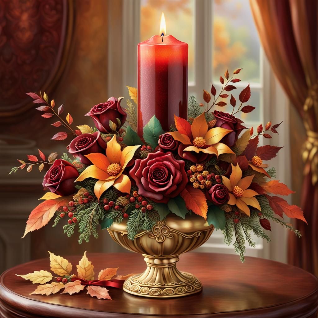 This image shows a historical ornament candle in dark red, gold, and dark green. An autumn flower bouquet with dried red roses and leaves is placed nearby, tied with an orange bow. The background blends dark red, green, and orange.