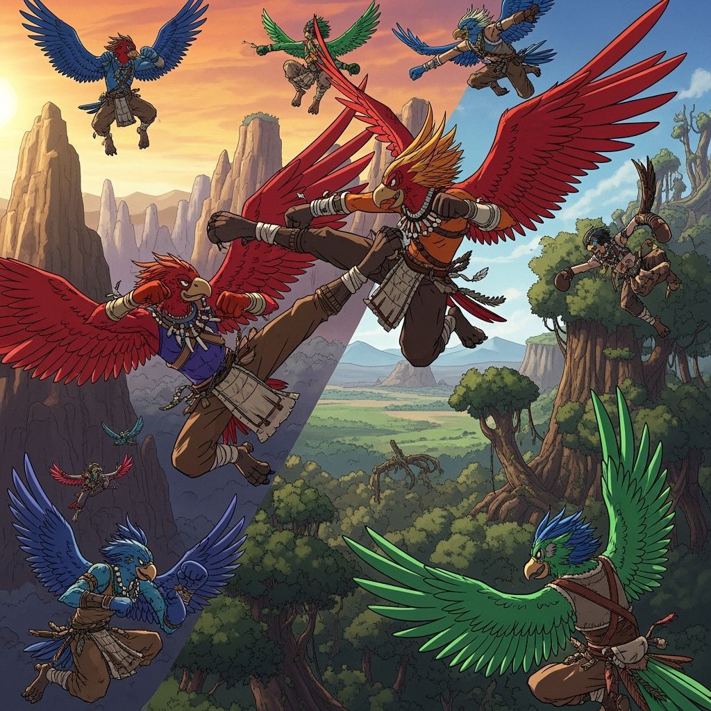 This image depicts tribal birdfolk nomads in dynamic kickboxing poses, rendered in a vibrant, cel-shaded manga art style. They soar through diverse landscapes with tribal attire and feathered wings.