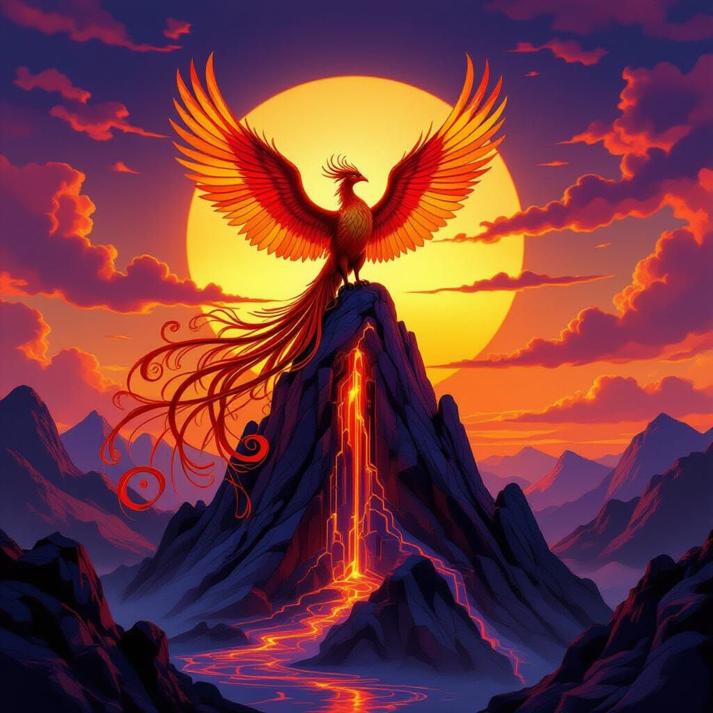 This image depicts a majestic phoenix with stained glass feathers resting on a glass mountain during a vibrant sunset. Created with Art Nouveau elegance and dramatic lighting, it features fiery colors and flowing molten glass.