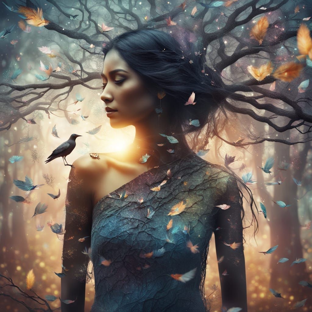 A striking picture of a tree transforming into an indigenous woman. This artwork features soft, feathery textures and a warm, earthy color scheme, rendered in a dreamy watercolor style. Shimmering light and iridescent origami birds enhance the mystical atmosphere.