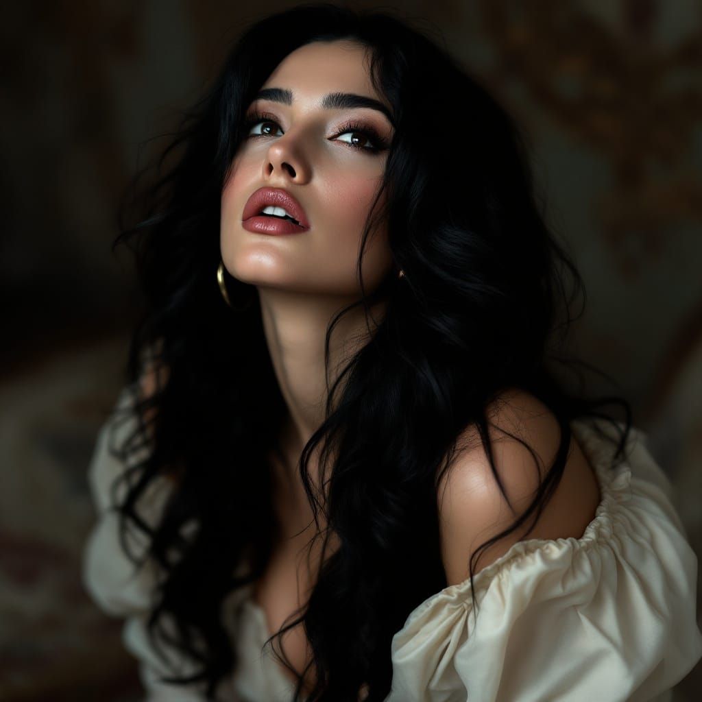 This image is a romanticized portrait of a woman with long black hair, piercing eyes, and a sultry expression, reminiscent of Art Deco style and dramatic lighting.