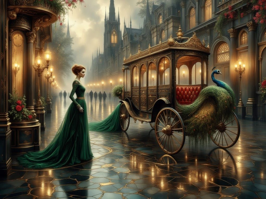 A striking picture of an elegant woman with green eyes and an ornate peacock-drawn carriage before a Gothic cathedral. Her emerald dress and the peacock's plumage gleam in lamplight, with Victorian-era detailing.