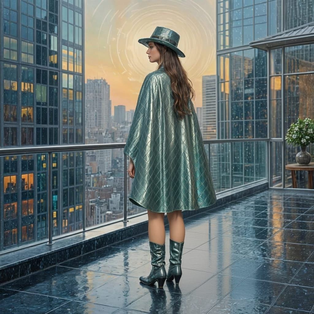 This surrealist oil painting shows an elegant woman in a scaly, green holographic cape and hat on a luxurious rainy terrace. She gazes at a city with reflective glass walls, rendered in a matte, melting style.