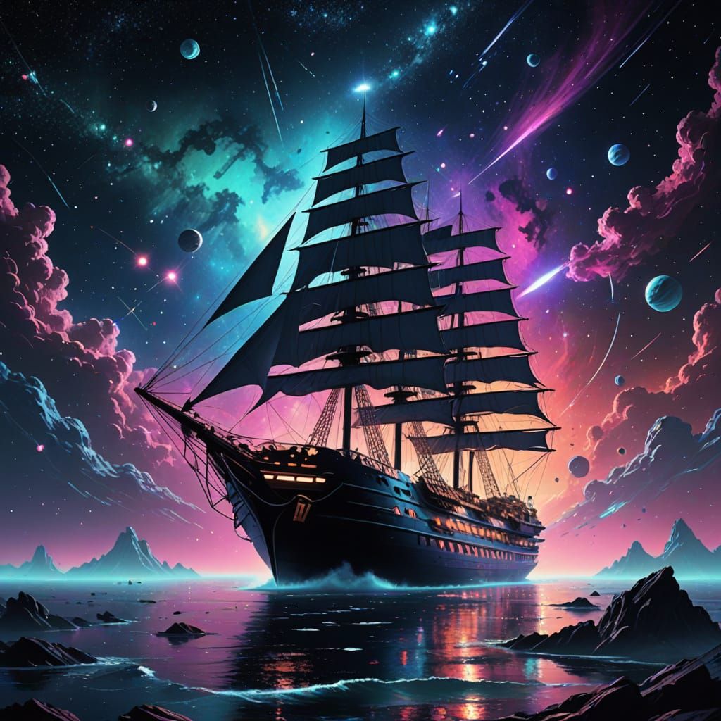 A striking picture of a sailing ship sailing through space. The ship navigates a sea of cosmic dust and nebulae, with constellations and shooting stars in a synthwave neon retro aesthetic.
