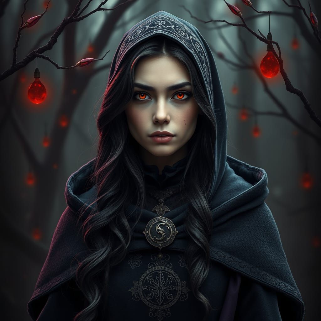A striking picture of a mysterious dark fantasy woman with long black hair streaked with silver, and vivid red eyes. She wears a dark crimson robe with a fur-lined cloak, set within a gothic medieval twilight clearing.