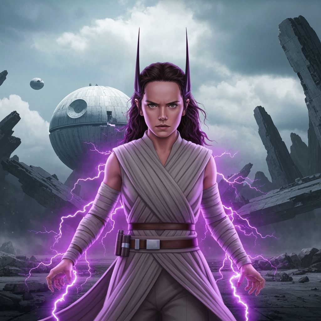 This image shows Rey Skywalker as a villain, unleashing purple lightning amidst Death Star ruins. Rendered as detailed concept art with beautiful composition and natural lighting.
