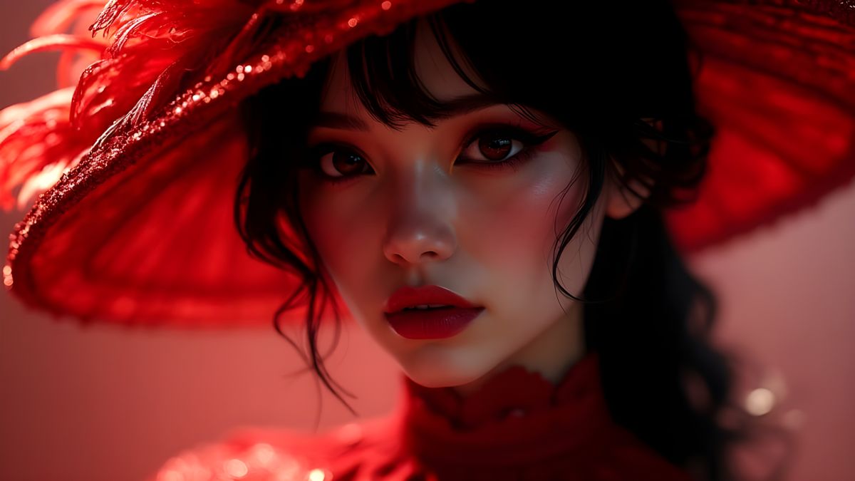 A close-up portrait of a fashionable woman with pale skin, dark hair, and a red dress. This digital art piece features vibrant colors, dynamic lighting, and intricate details in a hyperrealistic style.