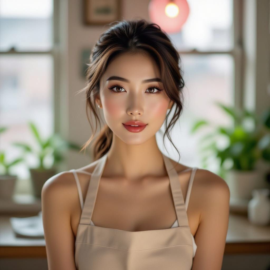 A photorealistic portrait of a captivating Asian woman with flawless skin and sensual lips, bathed in dramatic Rembrandt lighting. The image blends 3D anime art with vintage aesthetics.