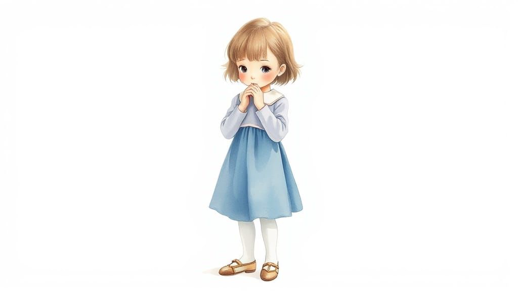 This image shows a nervous young girl with her fingertips in her mouth. She wears a long-sleeved shirt, blue skirt, and white tights, rendered in a delicate watercolor style with pink and purple hues.