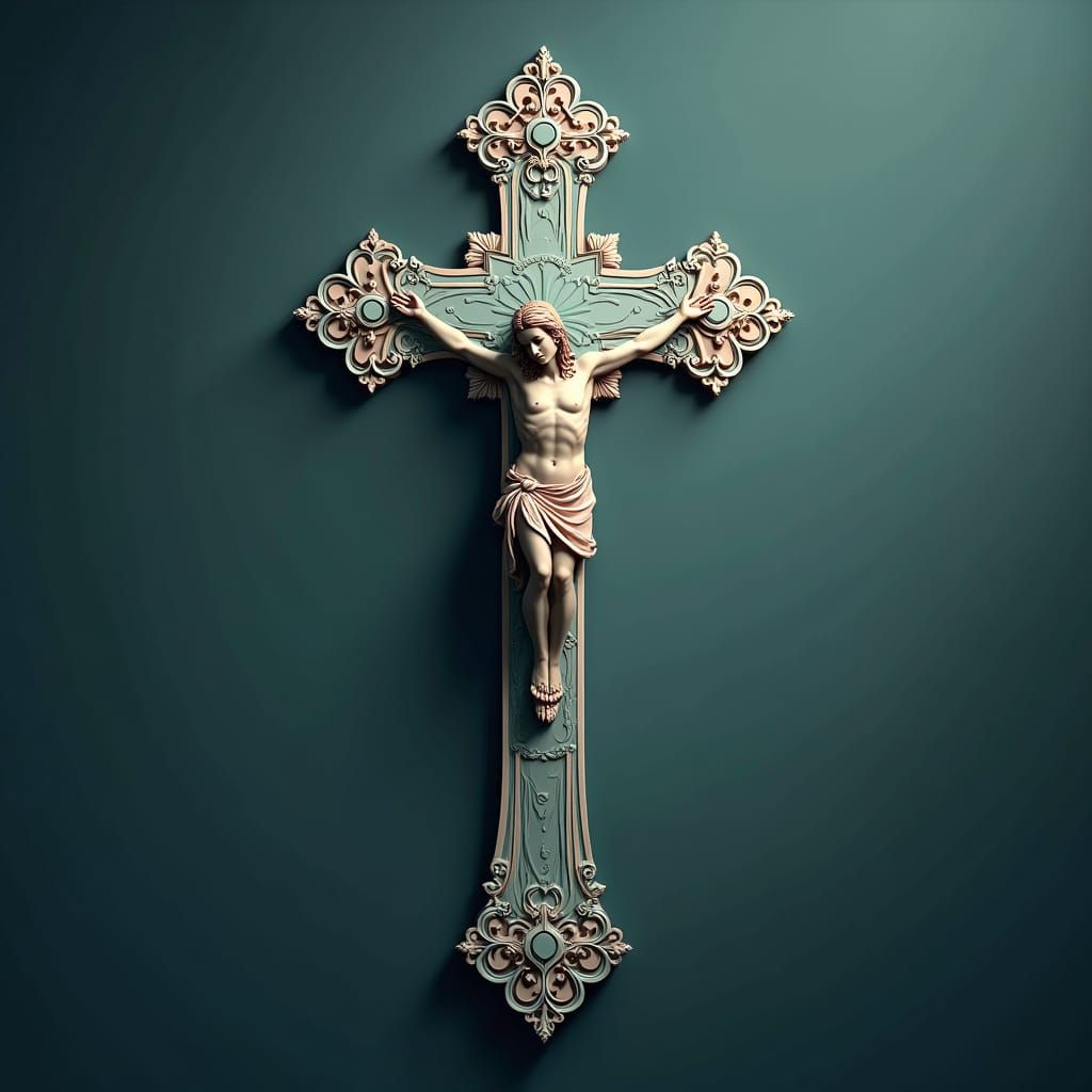 This digital art showcases a tall, ornate sliver crucifix accented with mint green. The wallpaper-sized image features a blend of navy blue and pastel peach, creating a serene and elegant atmosphere.